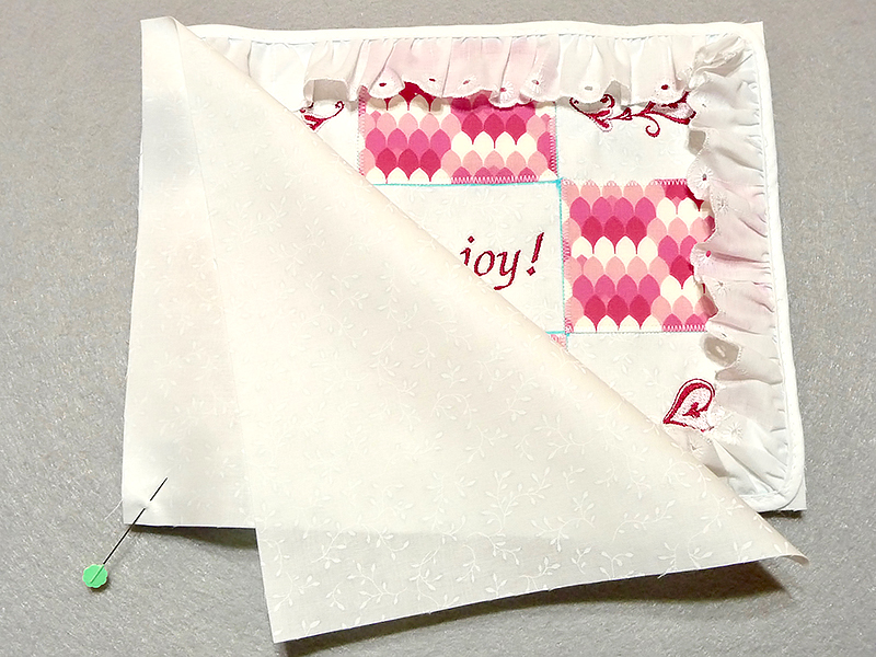 7. Mark off a 4-inch opening along the center of one side to allow for turning and sew pieces together using a ¼-inch seam allowance or a slightly deeper seam to hide the heading of the lace.