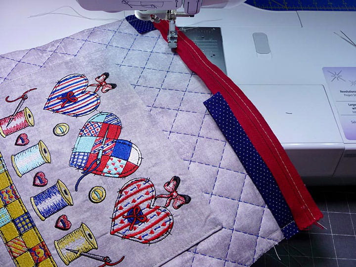Tuck lining to inside, push out boxed corners, and give the bag a pressing. Tie ribbon to zipper pull tab. You are finished! Enjoy using your crafty embroidered and quilted bag!
