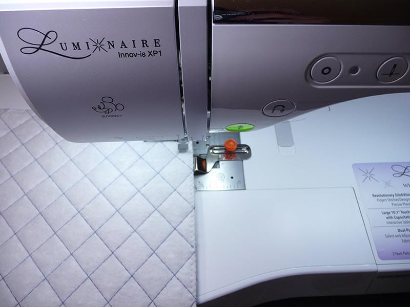 Begin by stitching along the two marked lines. Continue to stitch equally spaced lines until the whole piece is quilted. You can mark additional lines but there are other ways to space your quilt stitching. One option is to use a quilt guide mentioned previously. On my bag I opted to use the laser projection feature on the Luminaire. For this method, select Sub in the Guideline window and set grid size at 13mm. Align grid with stitched line and sew each subsequent line of stitching two grids apart from each line to space quilting lines spaces approximately 1-inch apart.