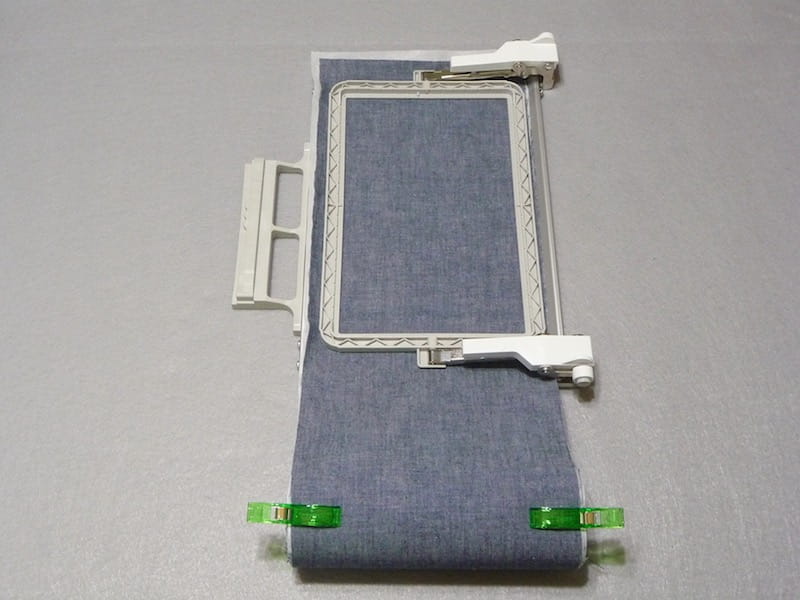 - Hoop fabric in the center of the border hoop along with a matching piece of stabilizer. It is helpful to roll and clip the excess at the end. See Figure #3.