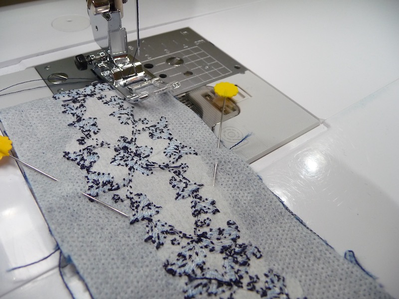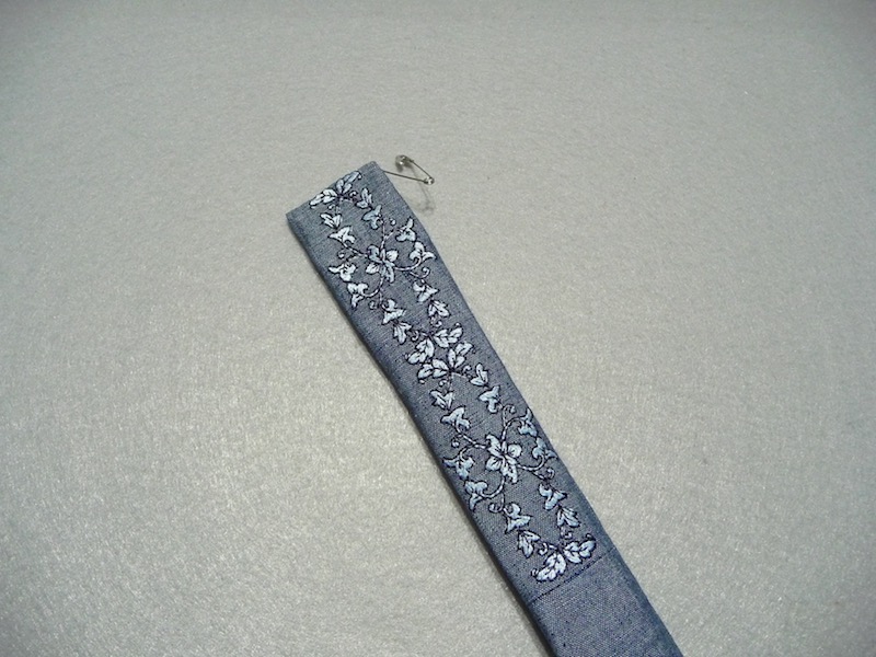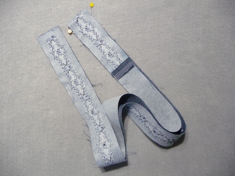 Turn strip right side out. Carefully shape embroidered end and press flat.