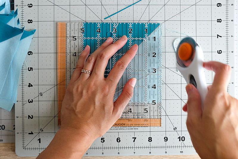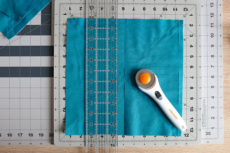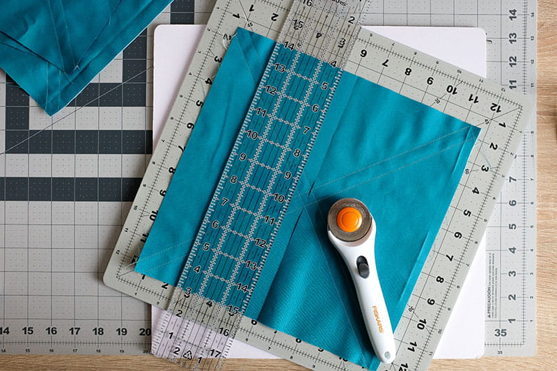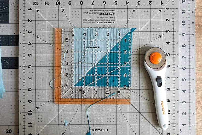 Teal and light blue fabric square with ruler overlaid next to a rotary cutter on a cutting board.