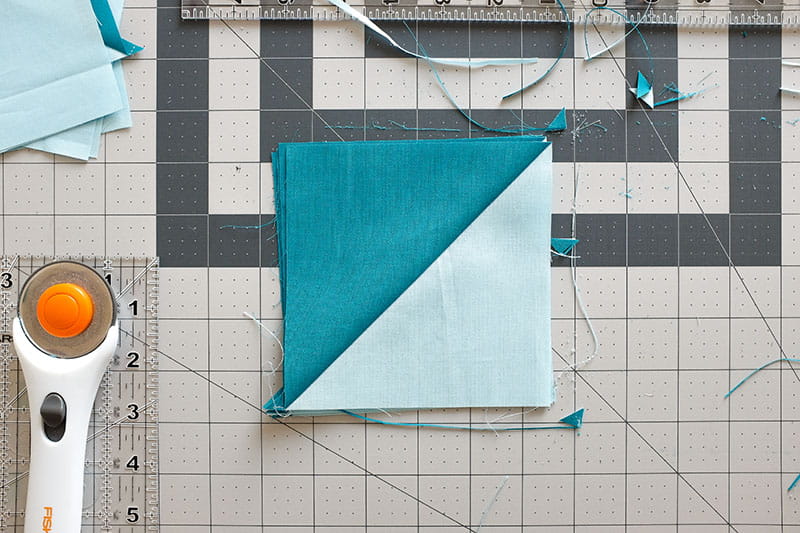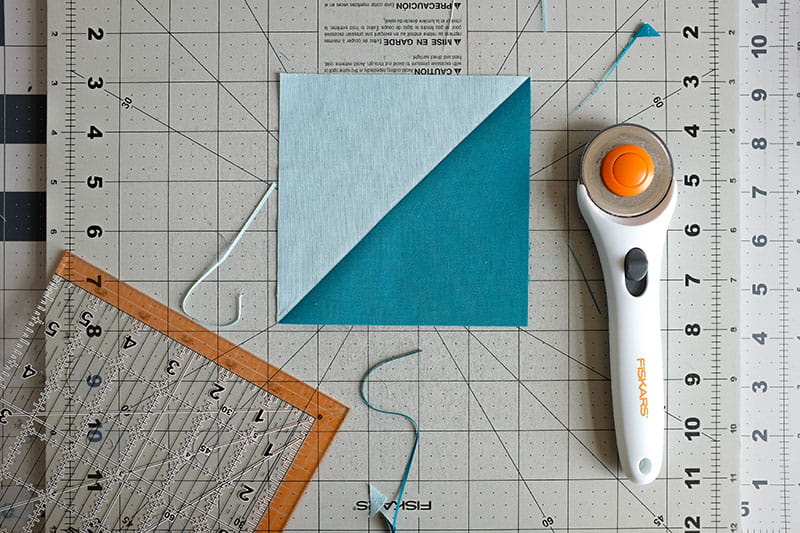 Light blue and teal half square triangle on a cutting board with rotary cutter and quilting ruler.