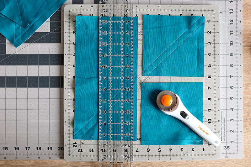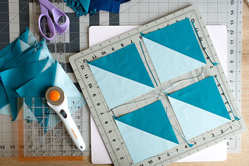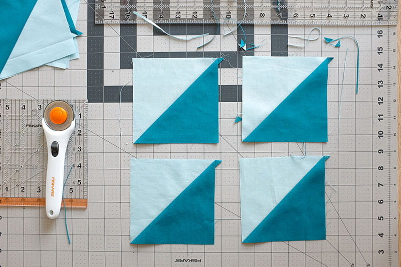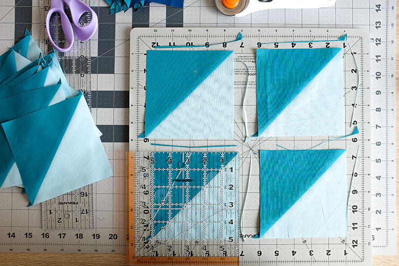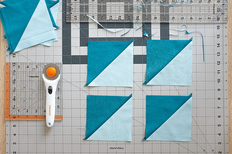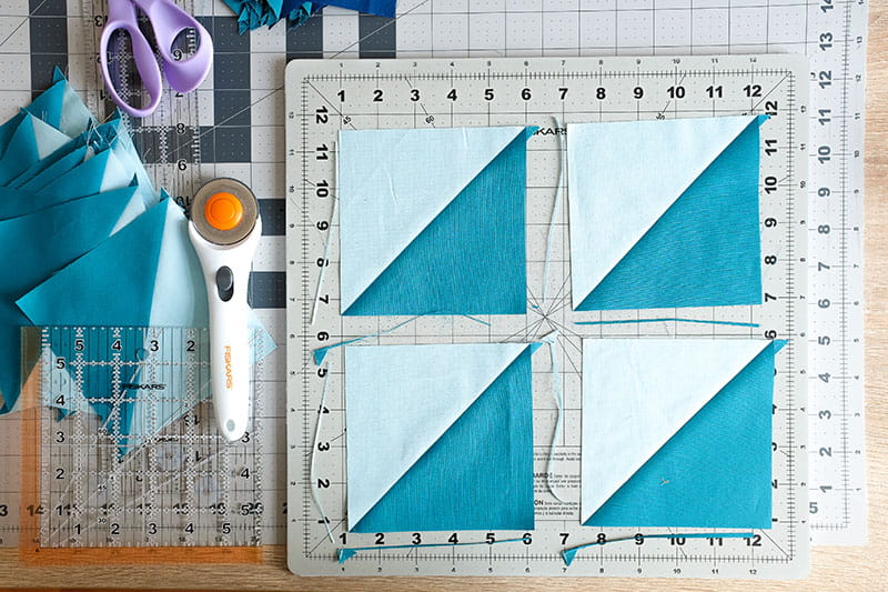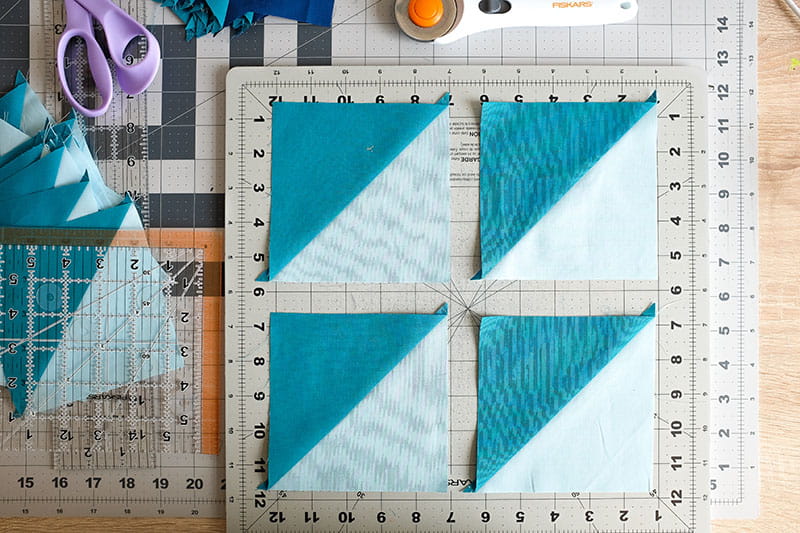 Four half square triangles on a cutting board with quilting rulers and rotary cutter.