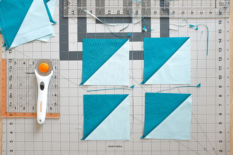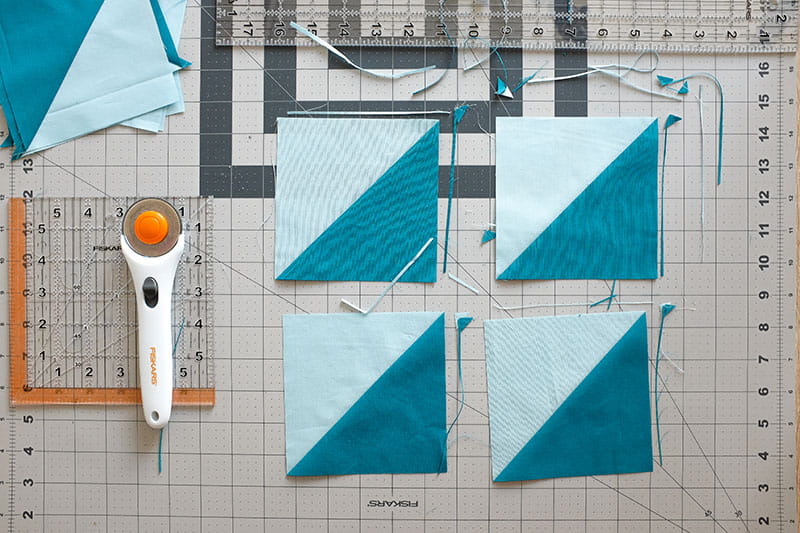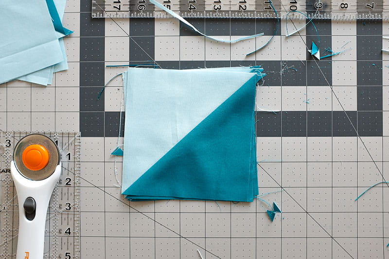 Trimmed half square triangles in light blue and teal on a cutting board with quilting ruler and rotary cutter