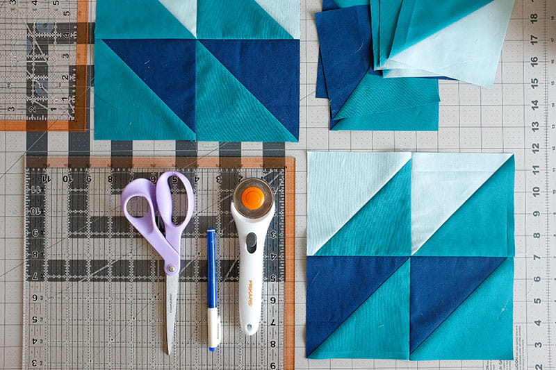 Blocked half square triangles with light blue and teal and royal blue and teal on a cutting board next to scissor, rotary cutter and fabric pen.