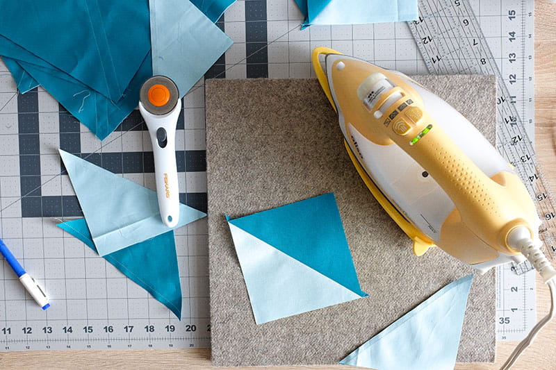 Iron next to two one half square triangle with additional fabric triangles to the side.