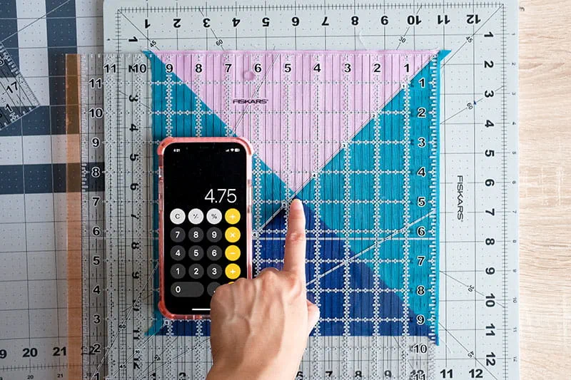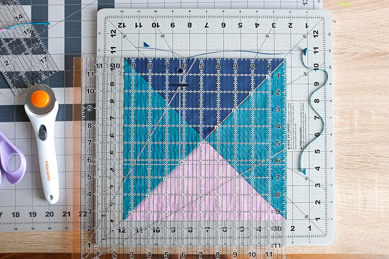 - Check the size of the trimmed QST and SQST as outlined in the quilt pattern. For the Geometric Jewels Sampler quilt pattern, each of the QST and SQST units need to be trimmed down to 9½in squares.
