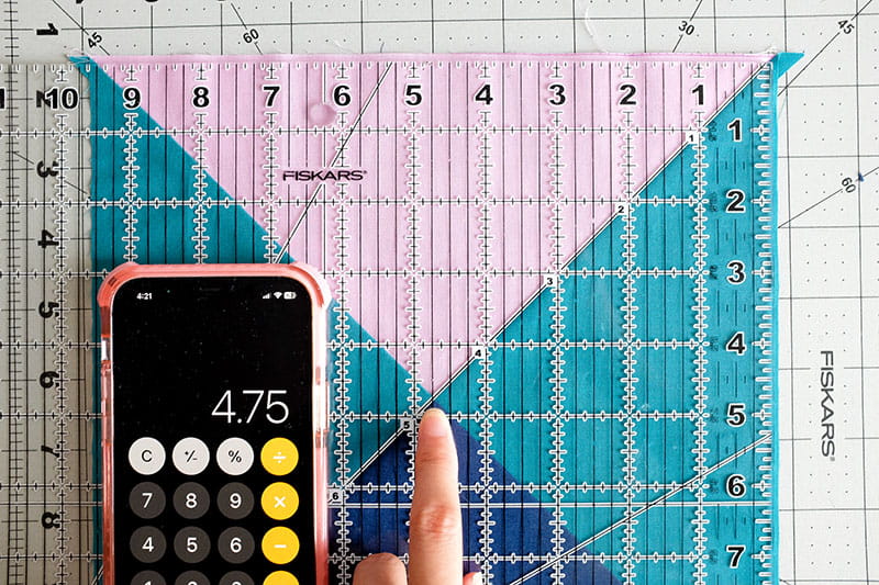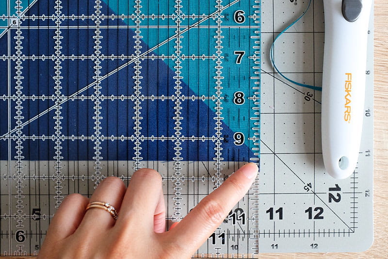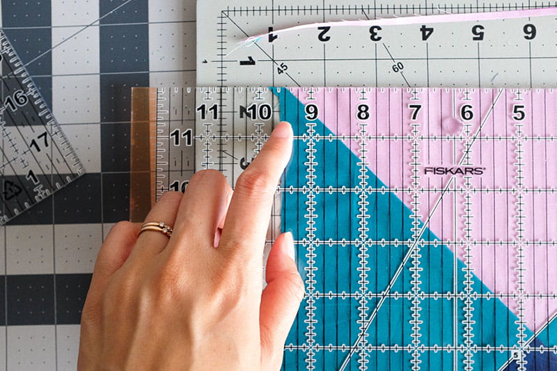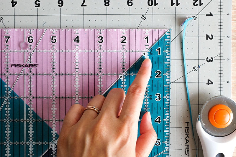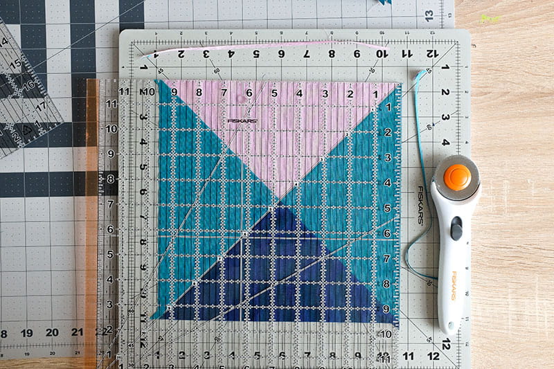 - The 45 degree-angle guide on the quilting ruler is matched up with one of the diagonal seams.