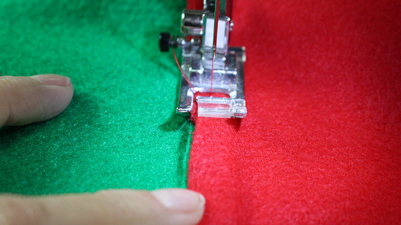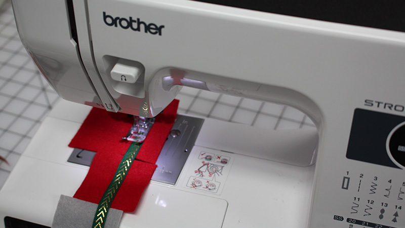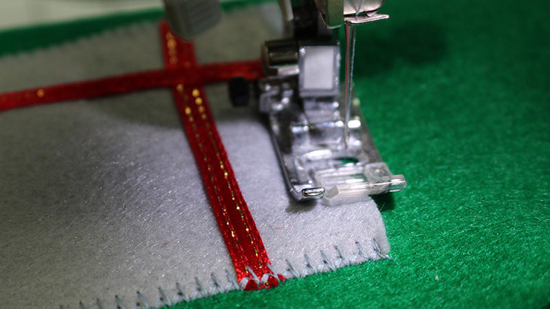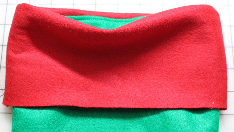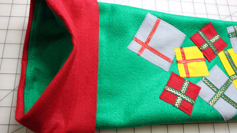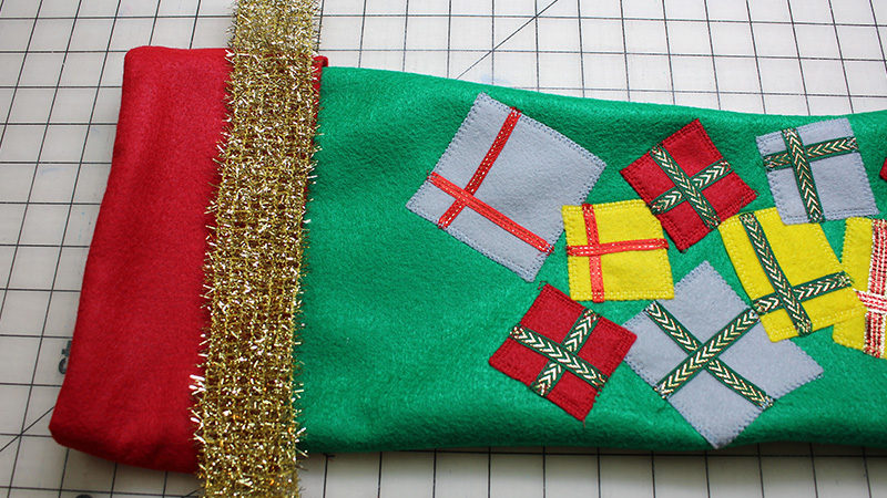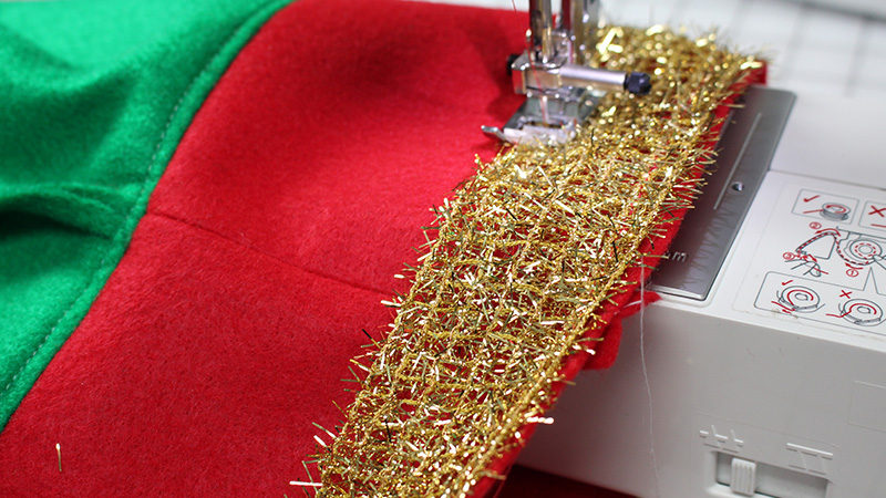 - Open the top flap of the stocking out with right side facing up. Stitch the trim in place.