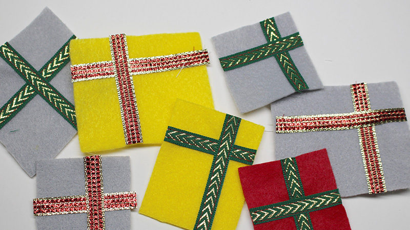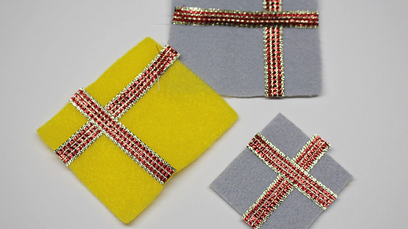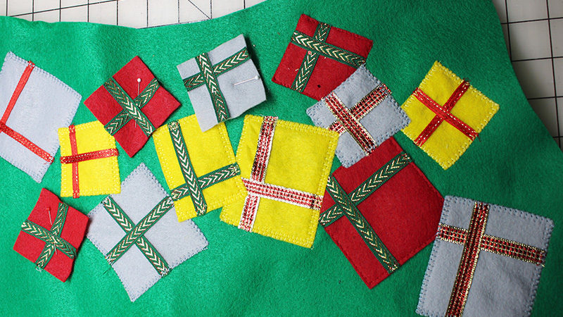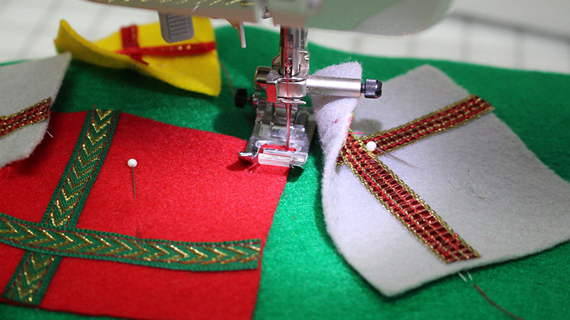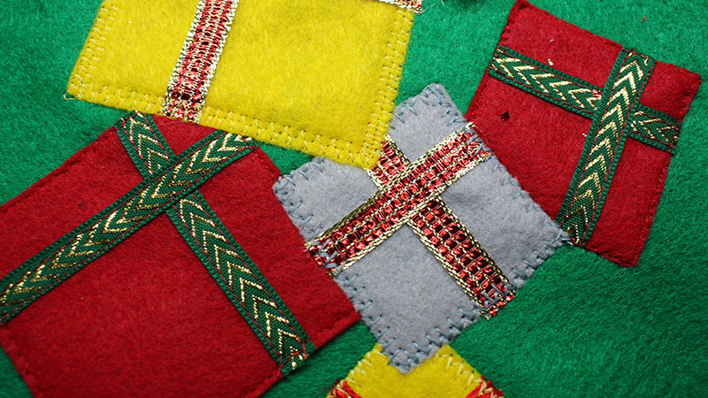 - Choose a different decorative stitch and continue to stitch around each package for each layer of boxes until they are all stitched on.