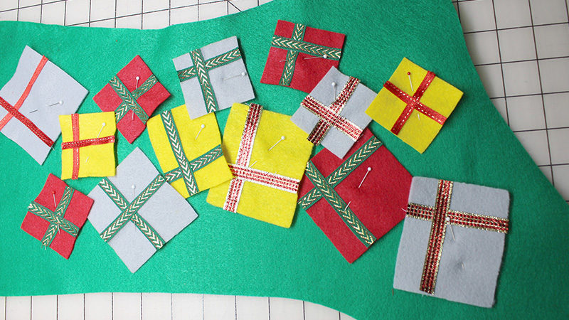 - Randomly organize and layer the appliques onto the right side of one-layer of the stocking and pin, as shown.