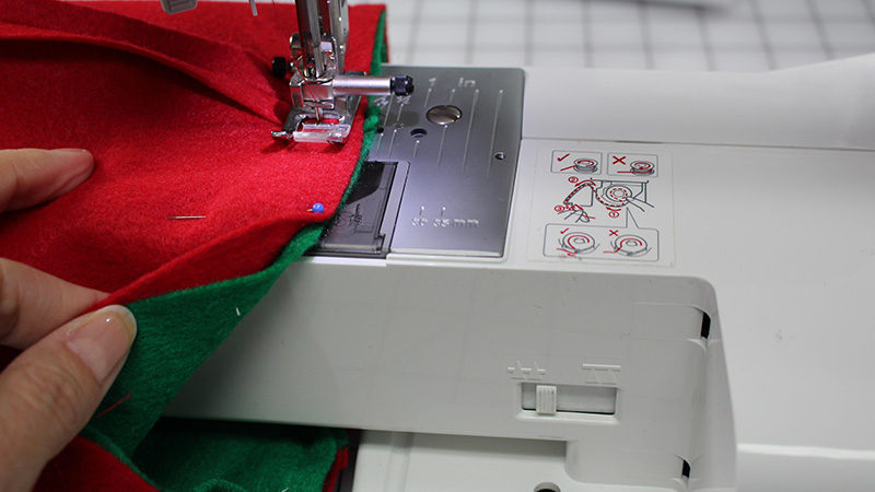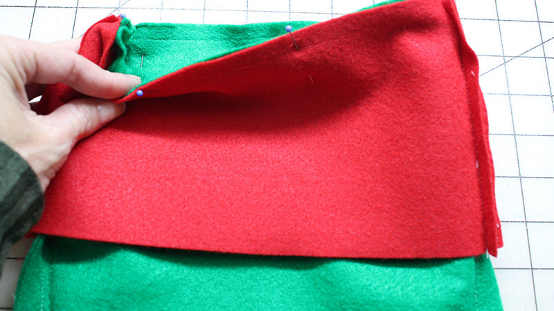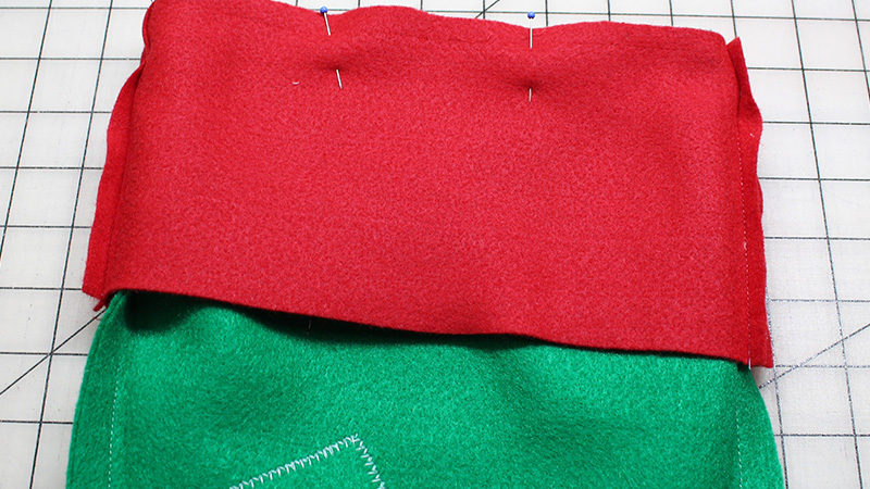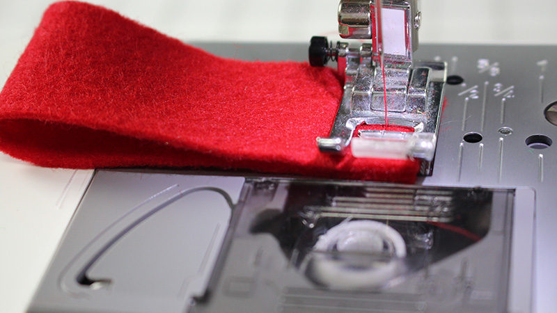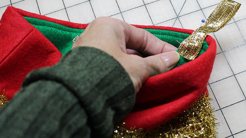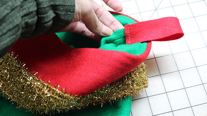 - Pin the loop to the seam allowance inside the stocking, about 2” from the top edge. Stitch in place.
