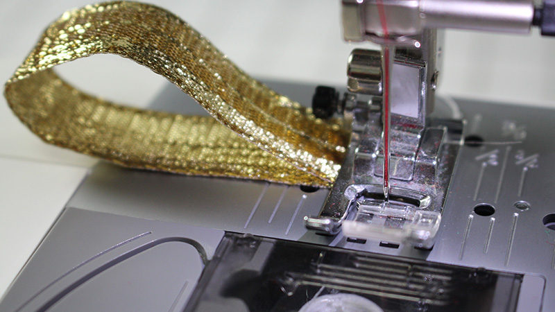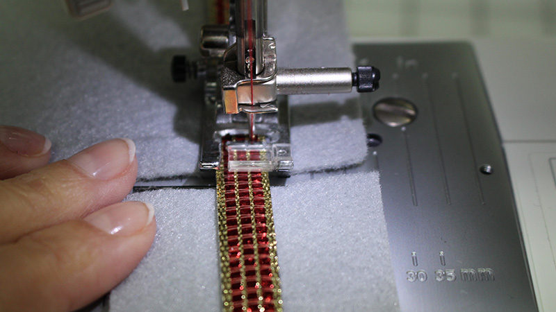 - Once you have sewn the boxes with the specific ribbon, cut the thread and remove the boxes from the machine. Turn the line of boxes around and line up the opposite side of the ribbon and stitch.