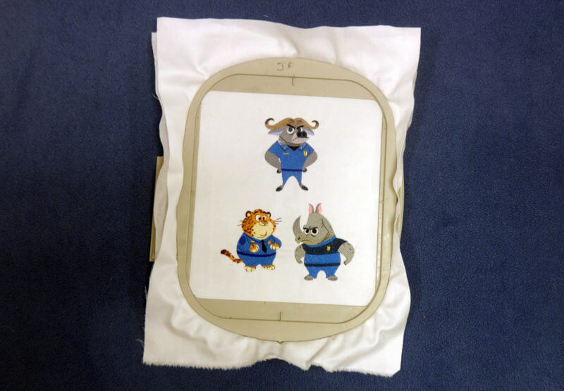 - Hoop stabilizer and white denim. Embroider three Zootopia characters