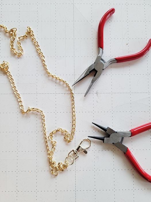 10. Create a lanyard by measuring the length of the chain. Be sure that you are able to take it on and off easily. Using the jewelry tools attach the chain to the clasp. Now attach the clasp to the O-ring. The clasp makes it easy to take on and off the wallet.