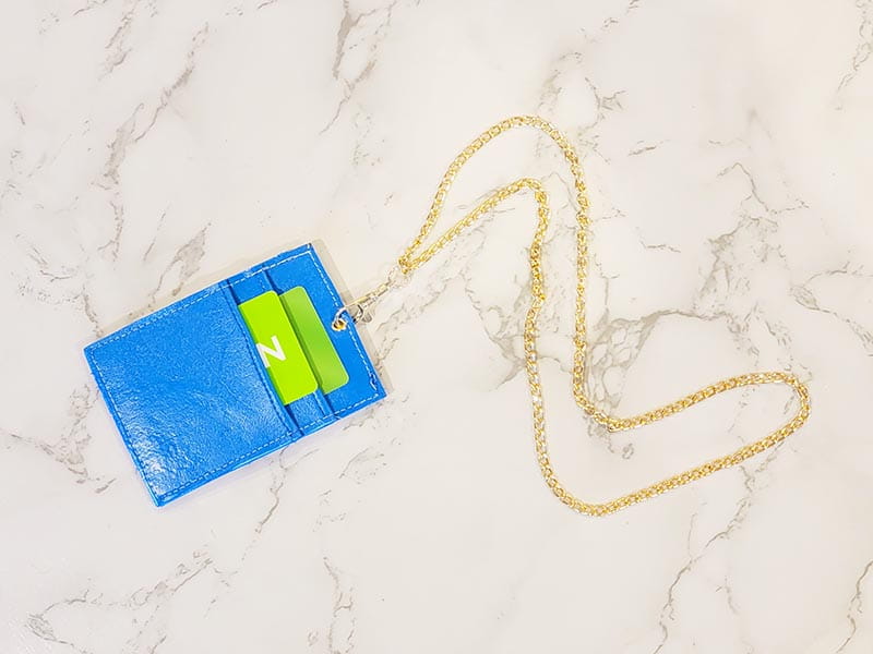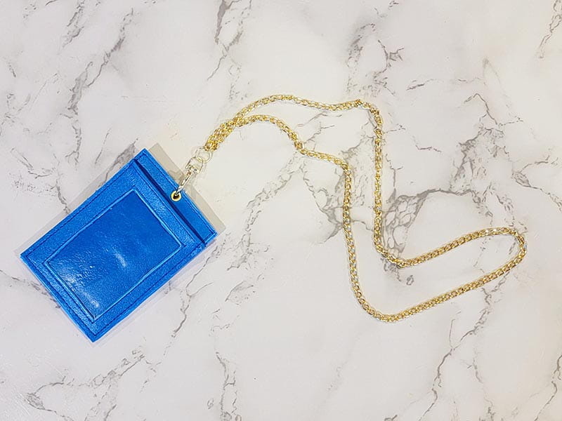 When creating your custom ID holder, there are so many great ways to personalize it. To start, faux leather comes in so many different colors. Choose your favorite. If you want to use a cotton fabric, go for it! Just be sure to use a thick interfacing like buckram. Another fun way to customize your ID holder is through the lanyard. You can go for a simple chain like I did, or you can choose something really fun like a beaded necklace. I love that idea. (I think I need to go find some beads)