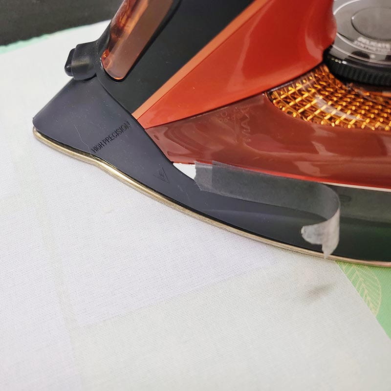2. Press the buckram onto the back of the faux leather being careful not to melt the leather. Use a pressing cloth if need be.