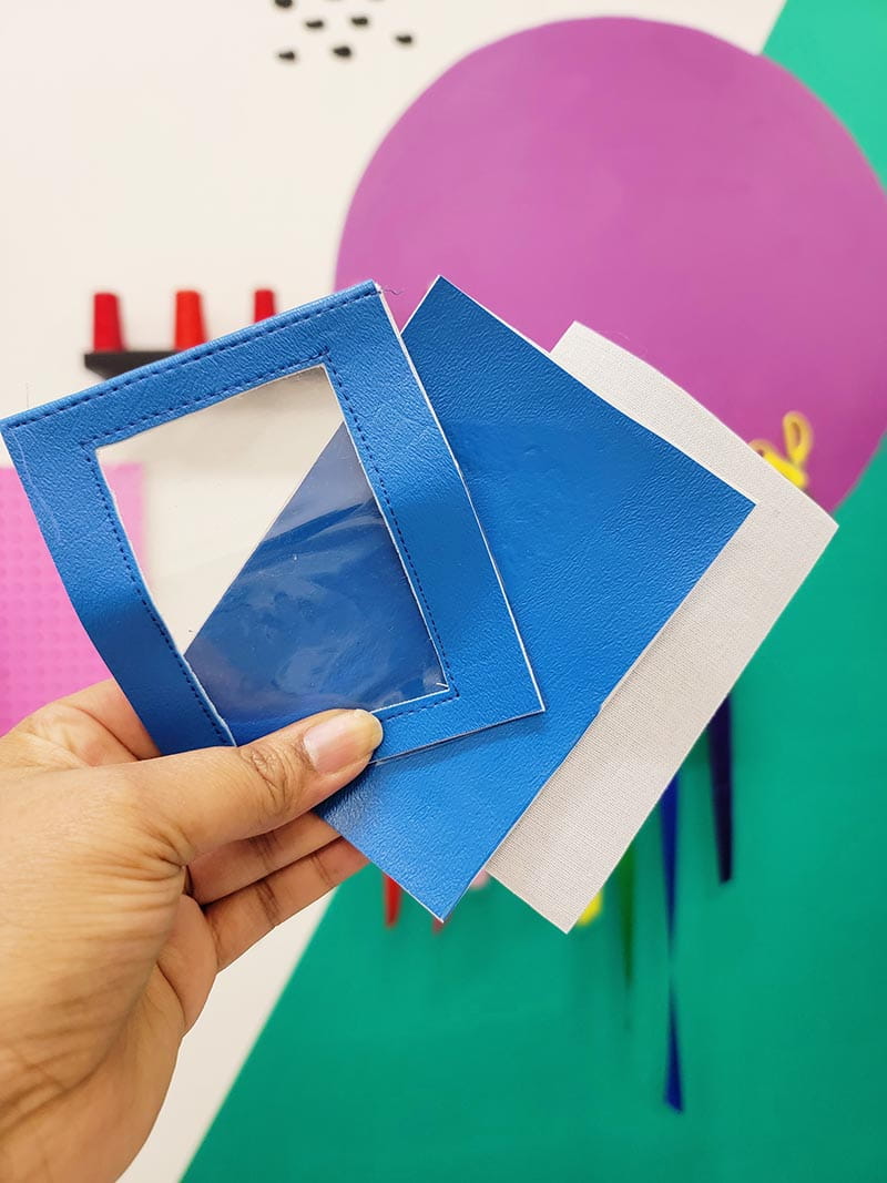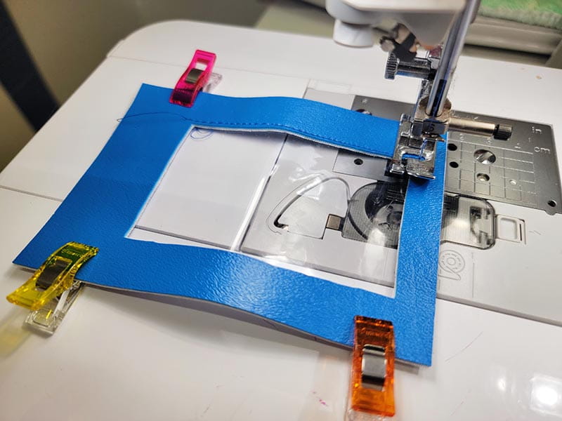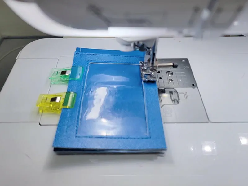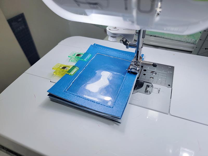 3. Starting with the faux leather with window and clear vinyl, sew the pieces together by sewing along the edge of the window. Make sure that the vinyl is sewn behind the faux leather fabric.
