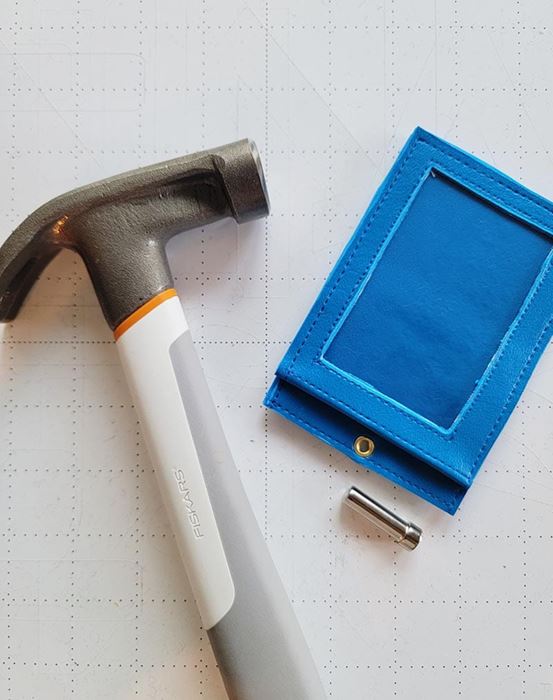 9. Punch hole at the top of the wallet using scissors and place a rivet inside. Attach using the rivet tool and hammer. Attach an O-ring within the rivet using the jewelry tools.