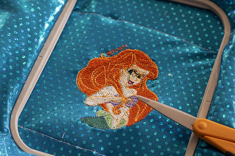 When the design is finished you can clip all the threads and remove the stitching holding on the stabilizer. Pull it away from the stitching for a clean back of your design. I used swim lining in my suit so I wasn’t really worried about how the design would feel.