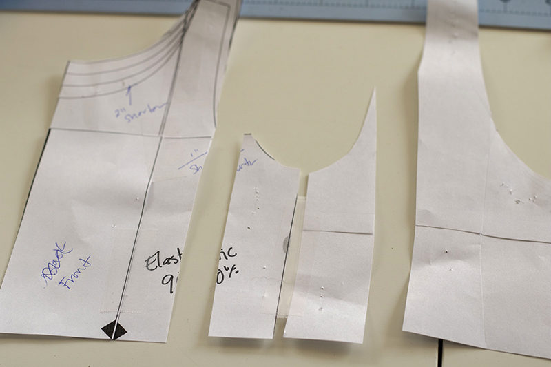 I took my swim pattern and cut it down the middle to make a two-piece suit. I then cut the side off the front and back and taped them together to make a color blocked side panel. You can do this with any suit pattern or just leave the suit all one color.