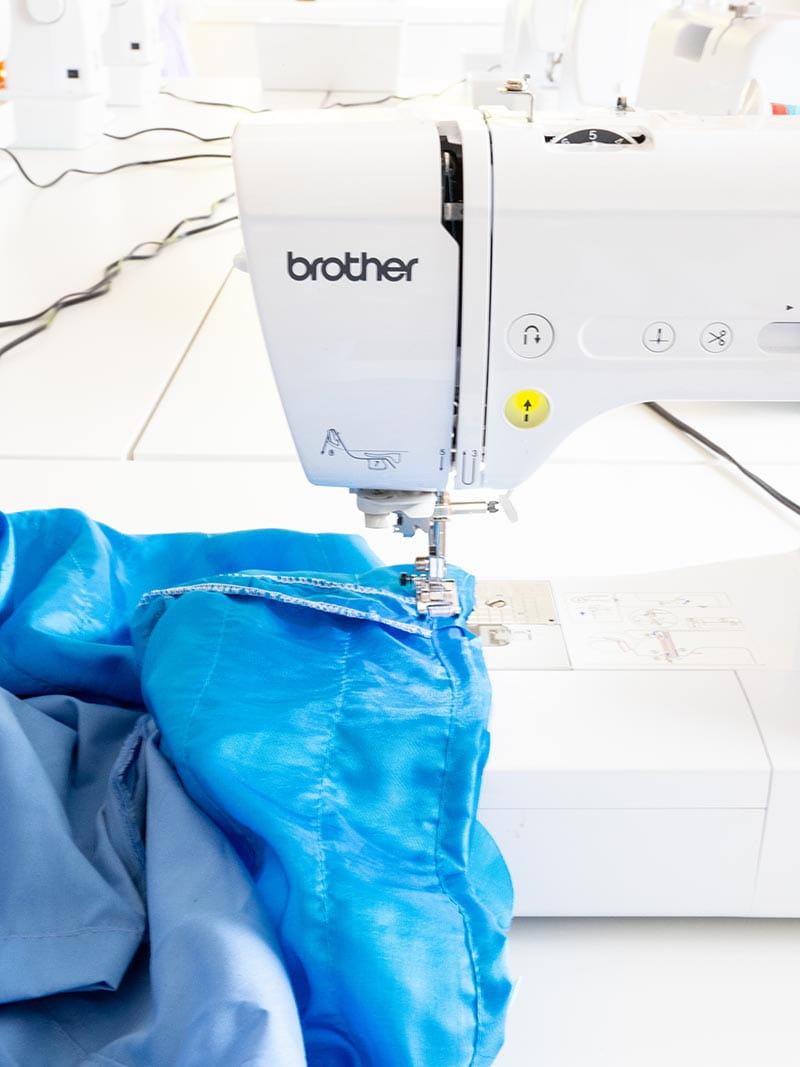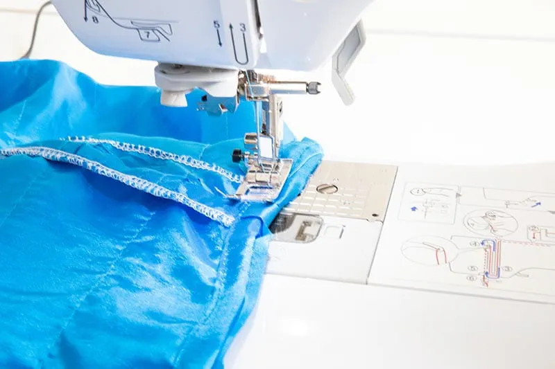 - With right sides together, pin the front and back pieces of the skirt together at the side seams. Sew the side seams with a straight stitch, leaving about ½" seam allowance.