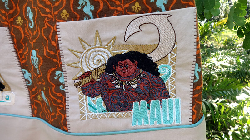 NOTE: Both the Moana and Maui designs selected for the pockets are stitch intensive, requiring iron on stabilizer. These designs will be hooped additionally with 2 layers of medium weight tearaway to prevent puckering.