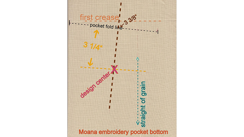 NOTE: These are the markings for Moana’s embroidered pocket. The pattern piece for Maui’s pocket will be a mirror image of this so the two characters will face one another.