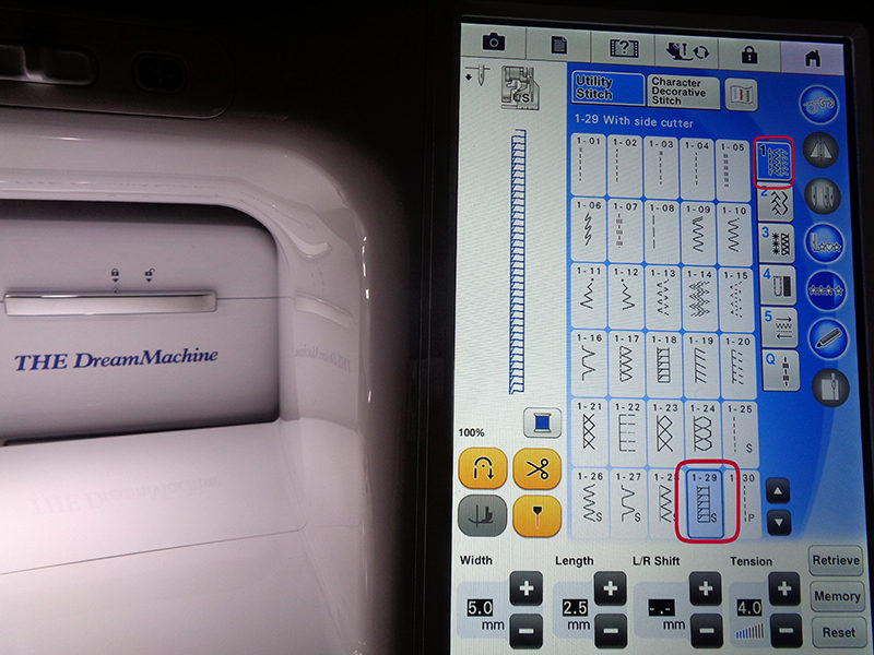 - Select an “S” (for side cutter) stitch from the menu on page 1. #29 worked well for me.