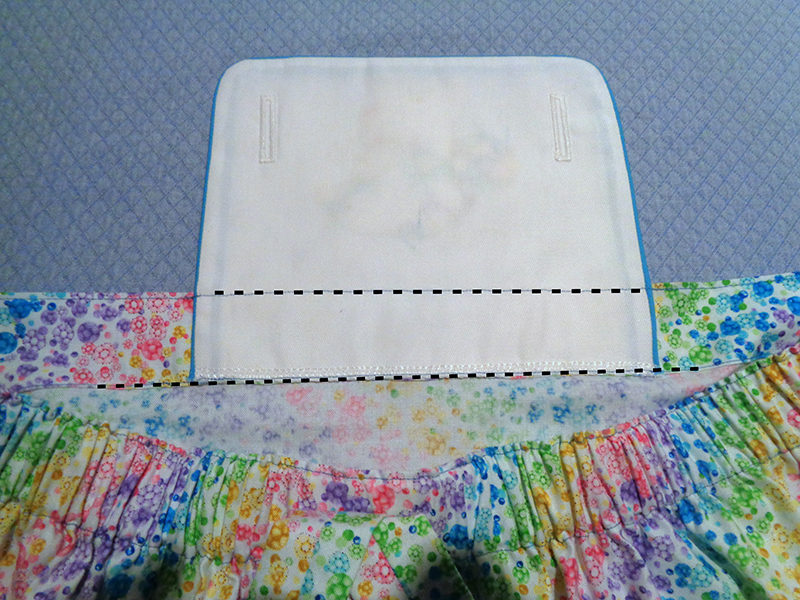 - Pin right side of the embroidered bib against wrong side of the skirt, aligning the center marks. Then stitch the casing closed, catching the clean finished edge of the bib in the same seam.