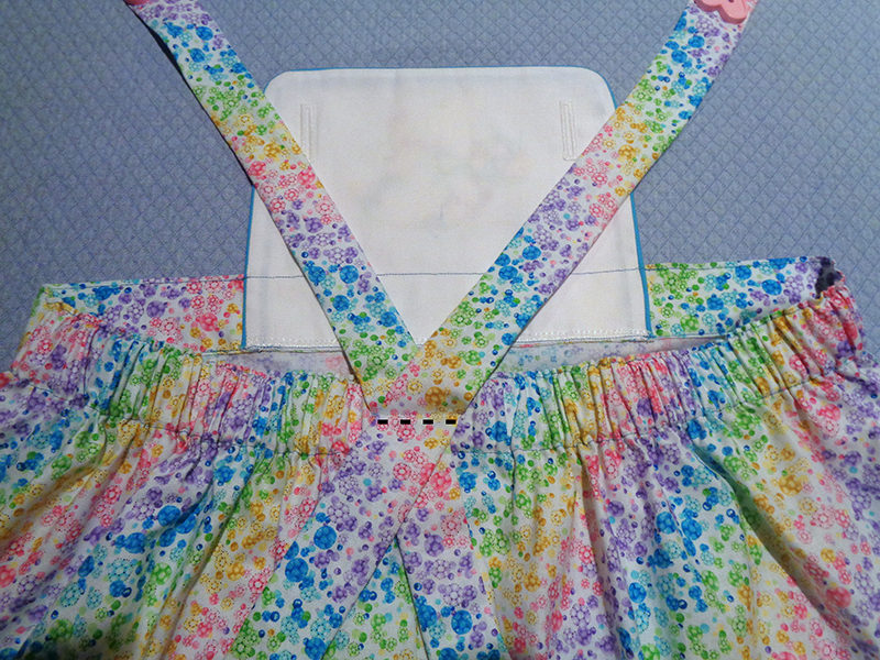 Note: Just like the dress bib, ½” was added to the bottom of the romper bib pattern piece. Then the white twill bib was embroidered, cut out as per the pattern and constructed. Piping was made from the floral print from the dress skirt and attached in the same manner.