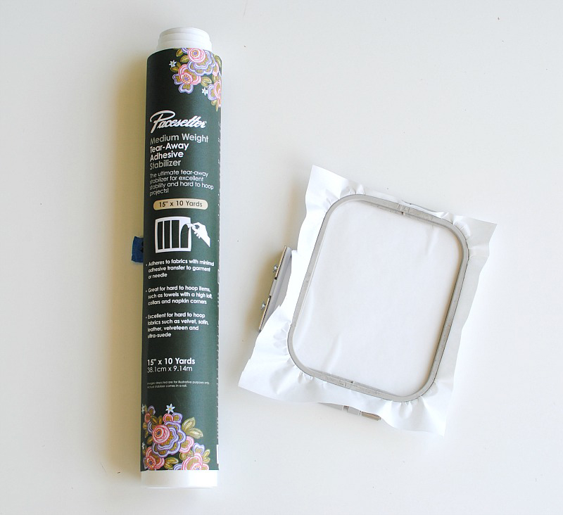 - Hoop Pacesetter Medium Weight Tear-Away Stabilizer so the adhesive side will be up once you remove the top layer. Once hooped, remove the top layer to expose the adhesive.