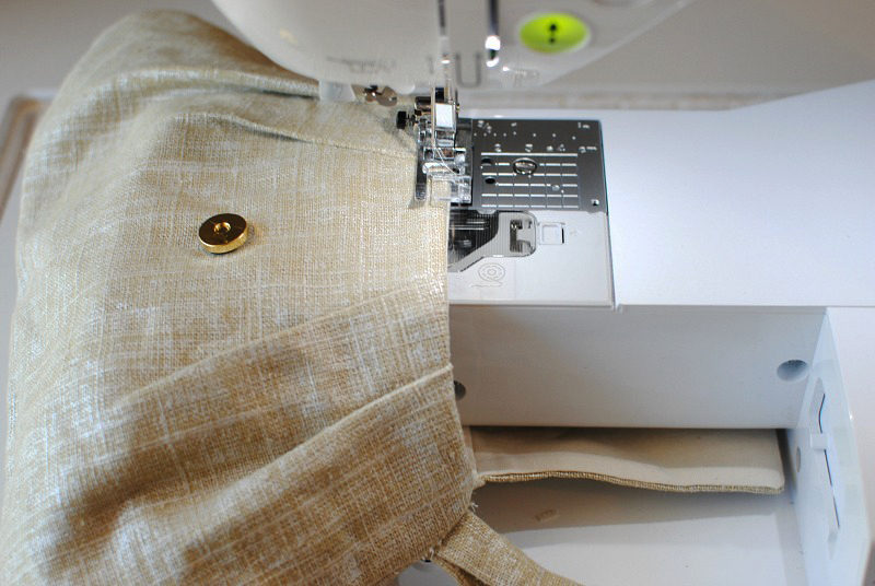 Turn the outer bag right side out, fold the flap down and mark where the snap hits the front of the bag.
