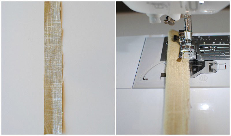 Fold the strap fabric in half lengthwise with the right sides together and sew along the edge. Turn it right side out using the loop turner.