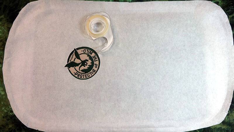 This handy stippled bag is sized to carry the necessary miscellany for a youngster’s overnight adventure. I love stippling and the interesting texture it gives a project. THE Dream Machine® has an amazing function that embroiders precisely spaced stippling stitches. This is a perfect project for mastering this technique as you learn to stipple around an existing design, the PTD04 Protector of the Wild. Creating the surrounding intricate curlicue stitches requires contrast between the design and the background fabric. However, on this project the design/background fabric combination gives too little contrast for an acceptable scan. There is an easy remedy. A solution to achieving adequate contrast is to cover the forest fabric background with stabilizer, leaving the embroidery exposed. Here’s how.