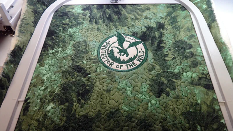 - Hoop 3 layer quilt “sandwich” with tan fabric on the bottom (right side out), batting, and forest fabric on top in 8x12 hoop. No stabilizer is used.
