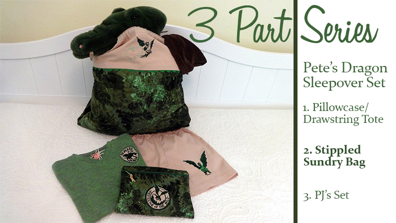 An excellent video tutorial by Angela Wolf is posted here at Stitching Sewcial. Her serger tucked zipper bag has unlimited uses—like this sundry bag for the Pete’s Dragon Sleepover set. First, follow the three steps below:- Cut the embroidered and stippled piece to 9 x12, approximately 1” beyond the stippling stitches.
