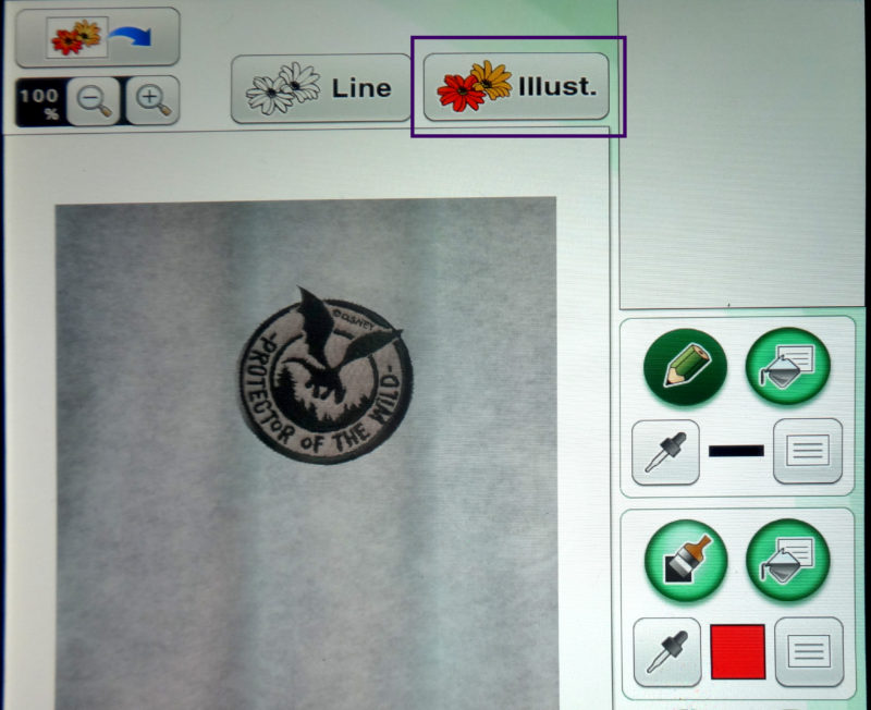 - Select the Illustration design key with the double flower. This changes the scanned image into an embroidery design.