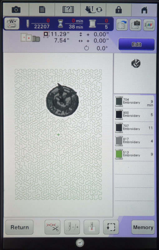 - Scroll down through the embroidery colors until you get to the stippling. PTD04 has been made a part of the stippled embroidery design. Since that was previously embroidered, only the stippling remains to be stitched.