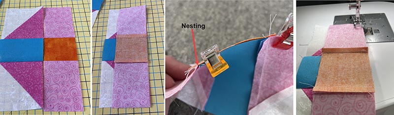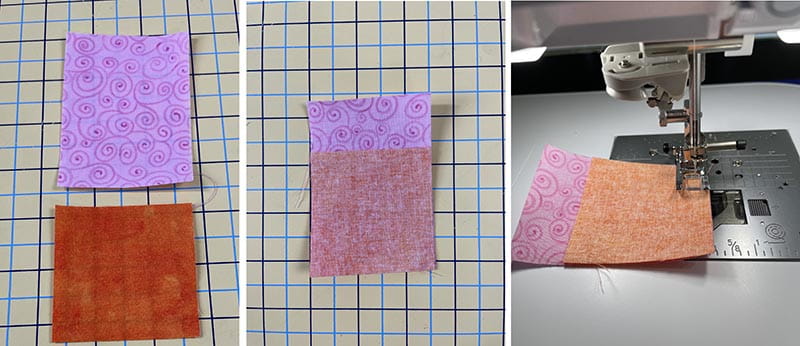 11.Attach the other light pink rectangle to the bottom of the orange square in the same manner. Press seams towards the orange fabric. This will allow for nesting seams with the 2 side pieces.