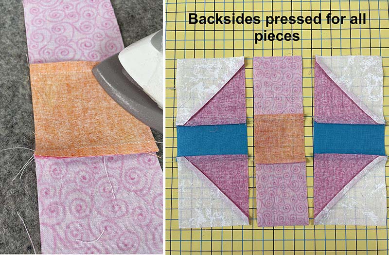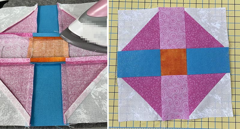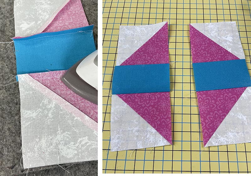 9. Press the seams to the blue rectangle and set aside. Repeat for other side.