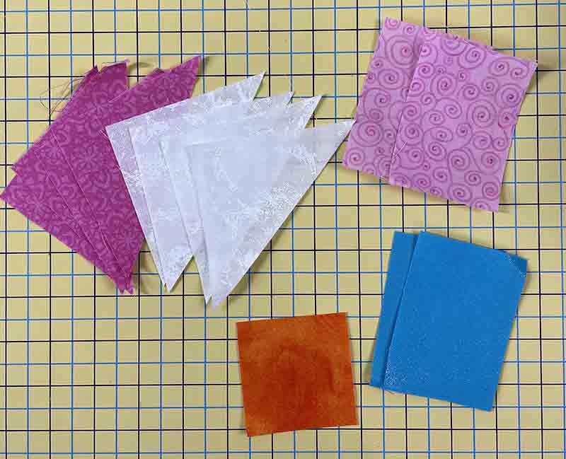Once you have your fabric prepared, cut out the individual colors. For this block, we used a white, light pink, a darker pink, an orange and a blue. You can change the color scheme to your taste. This one is made to look a bit like a flower.
