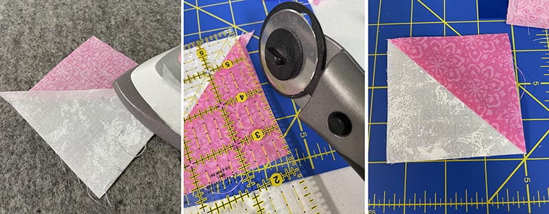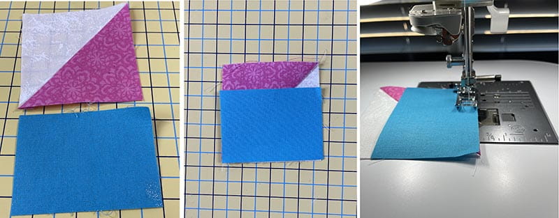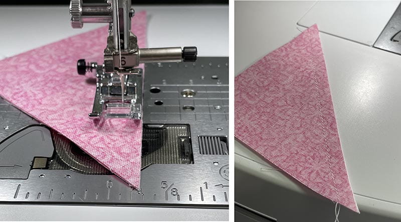 3. Place a white triangle and a pink triangle RST and stitch using a ¼ inch seam along the long side of the triangle.
