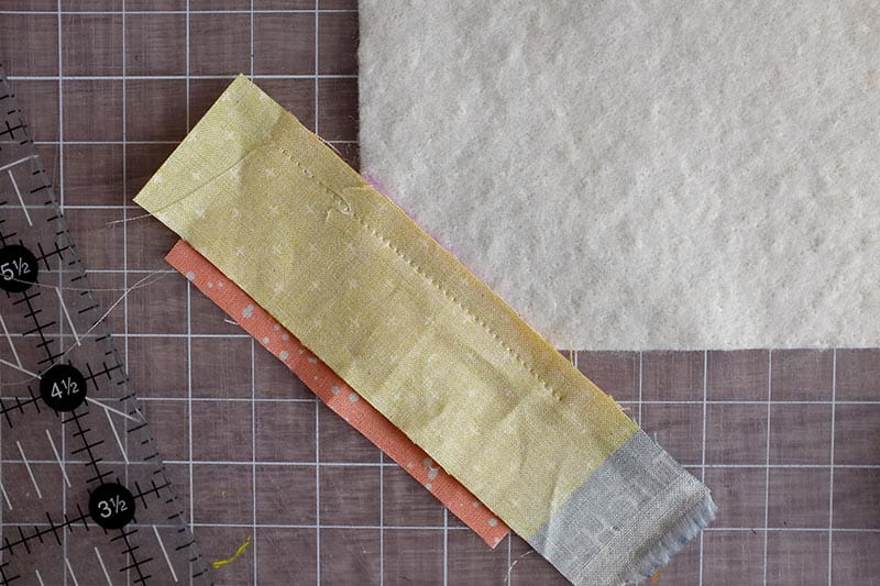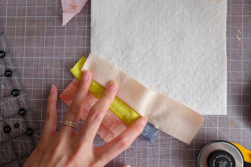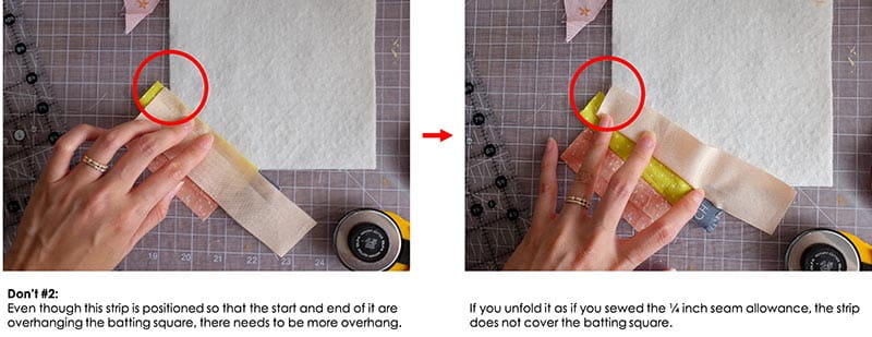 Tip: Take extra care when auditioning and sewing strips. Check that the fabric covers and overhangs the batting square when you fold the fabric over before sewing it into place. You may need to reposition the strip or cut another scrap fabric strip to cover the batting with some overhang. See below examples of what not to do and what to do.