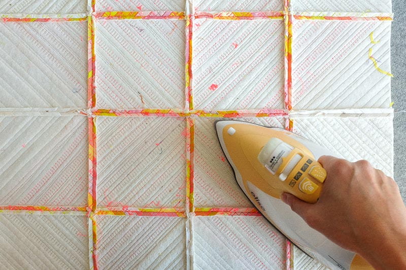 - It is very tempting to remove the excess batting and fabric strip scraps at this point. Don’t do it yet! We’re now going to take your project to the next level, by adding additional decorative quilting stitches and switching to a different coloured thread to make your project pop!