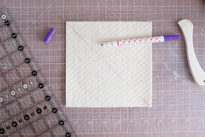 - On one side of one 6" scrap batting square, draw a diagonal guideline from the top left corner to the bottom right corner with a fabric marker. This marked line indicates the wrong side of the quilted block and will be used as a guide for squaring up the quilted block at a later step.