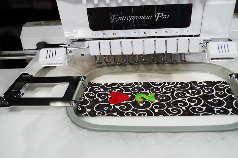 - The PR1000e will Tack Down the Bookmarker Front fabric and the Placement Stitches for the two Appliqué elements (the Heart and the number 2). The PR1000e will stop prior to Color Change 4.