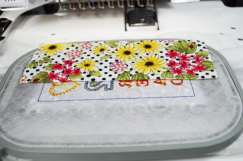 - Place one of the 3” x 8” Bookmarker fabrics on top Placement Stitches, then initiate Color Change 2 stitching. The Bookmarker Front Fabric will be trimmed in a later step.
