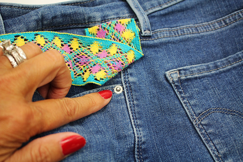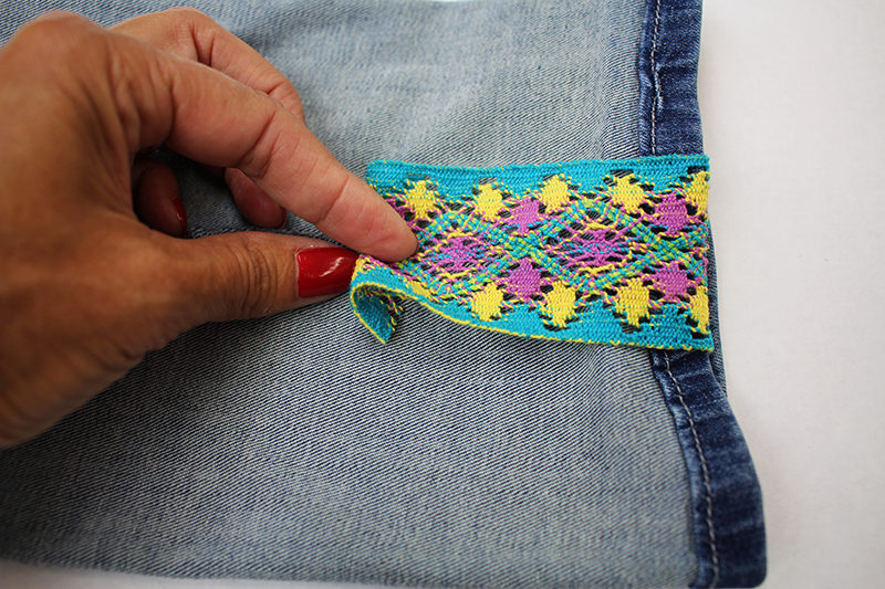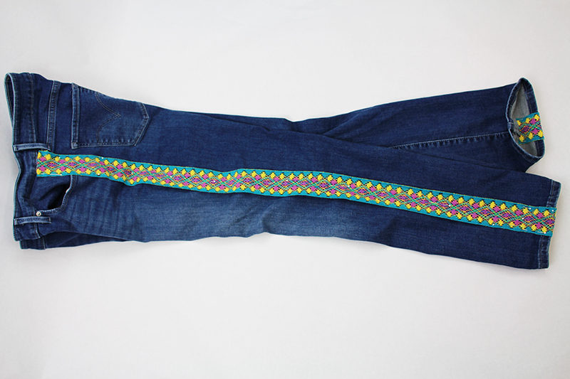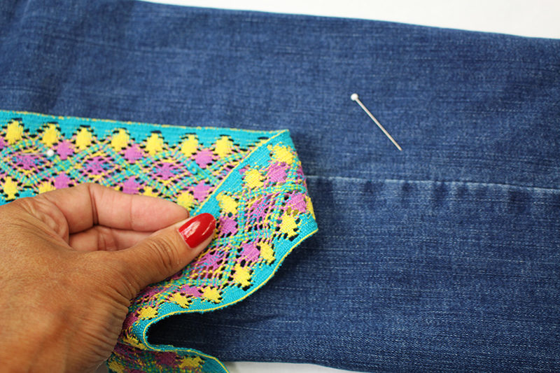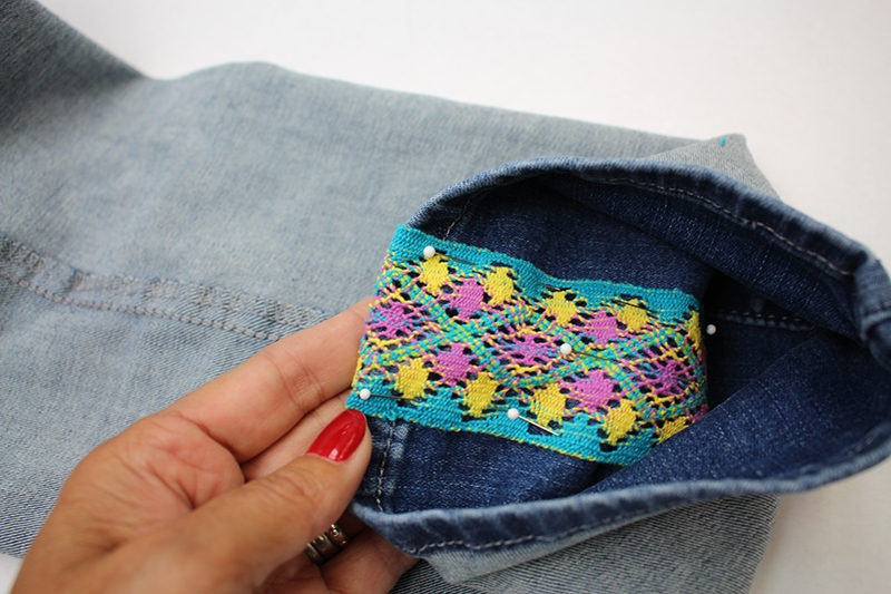 - Turn the jeans inside out. Center the ribbon on the seam allowance, fold under the raw edge ½” and pin in place.